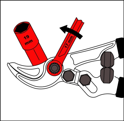 d. Turn the n° 17 wrench and branch-cutter simultaneously ( the same way as the arrow ) until the blades are able to rotate.