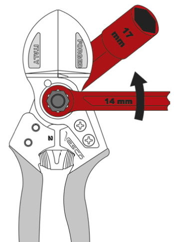 d. Turn the n° 14 wrench and shears simultaneously ( the same way as the arrow ) until the spring is able to open the shears